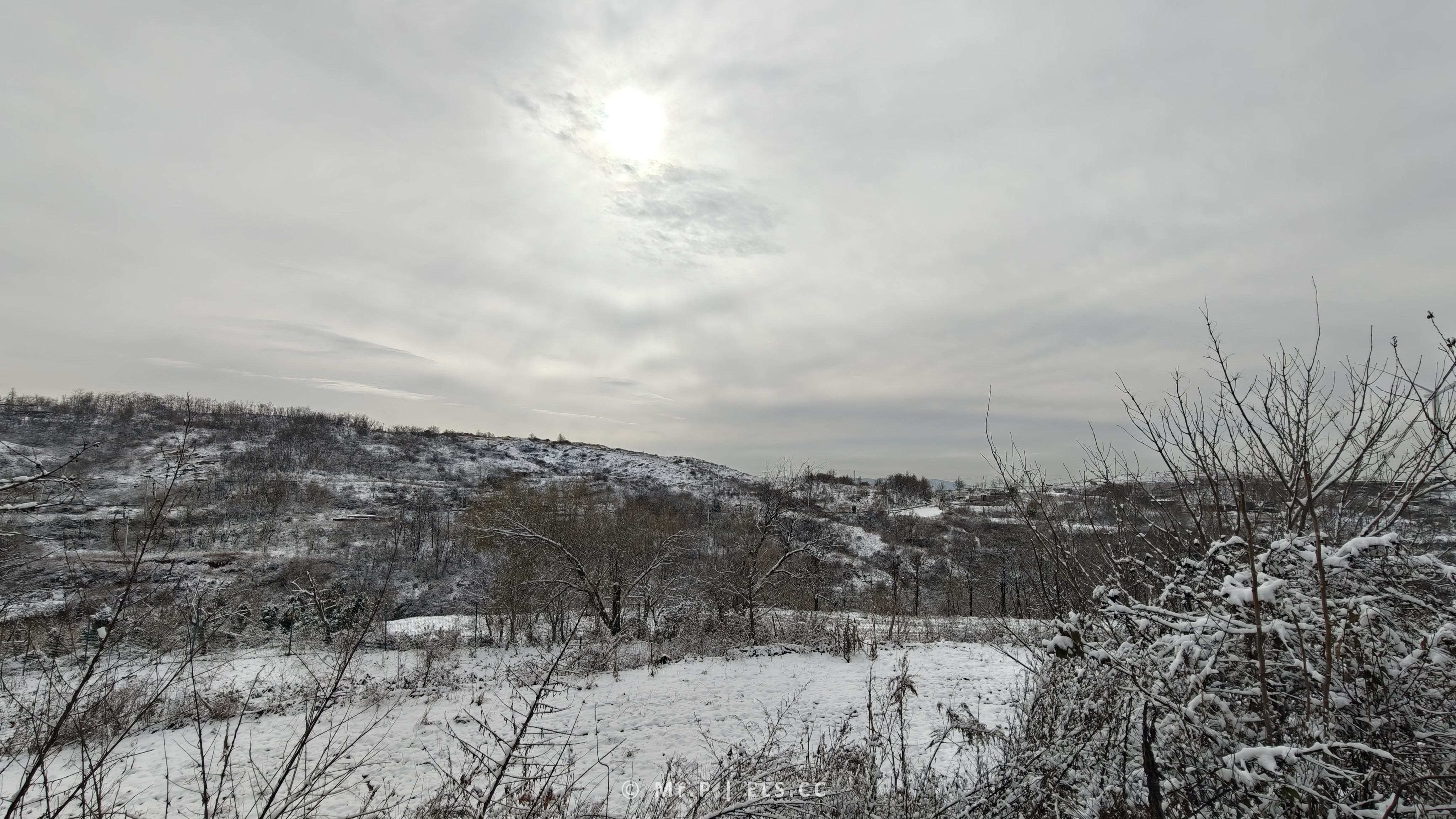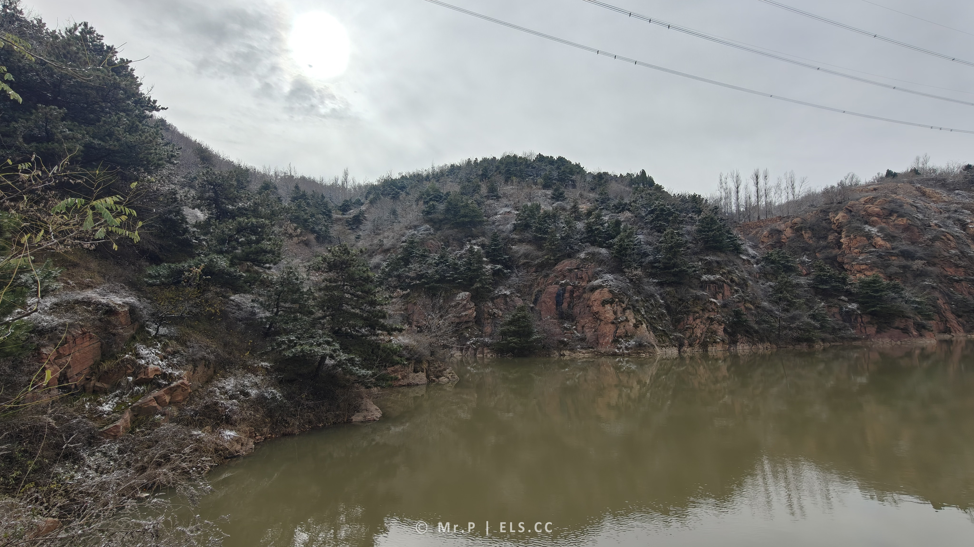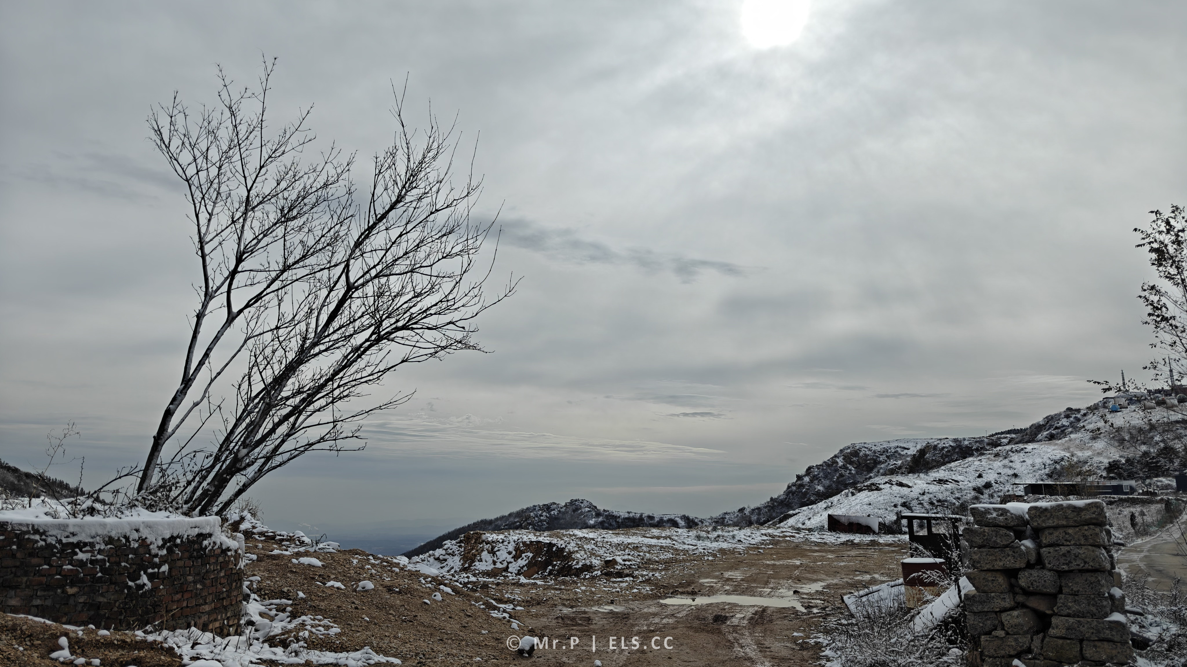 午后,太阳终于冲破云层,阳光洒在覆盖著薄雪的山峦上,似金光似银光似一个时光回廊。